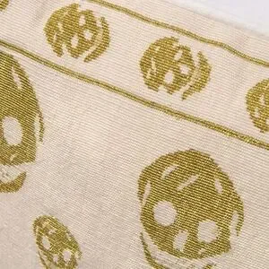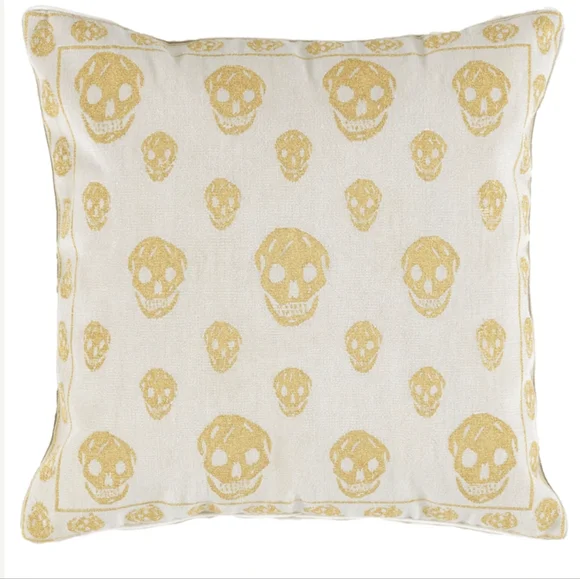 Stylish throw pillow with a skull pattern. Features a cream background with gold skulls.