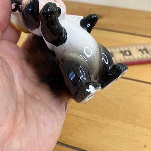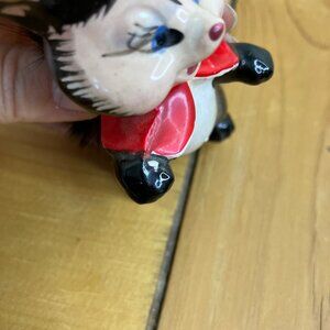 Vintage set of 2 ceramic figurines of a cute skunk couple wearing yellow hats, one with a yellow collar and the other with a red collar. Both have real fur tails. Approx. 3 1/2" tall x 2" wide x 2 1/2" long. Pre-owned vintage condition: Figurine with red collar has a small chip to the right foot and small unpainted spot on right hand. Both figures have normal wear from display/storage.