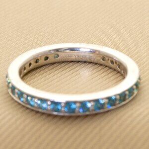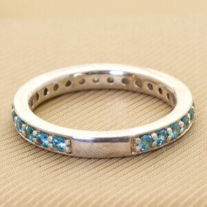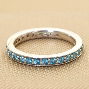This pretty ring has tiny, light blue CZ stones set all the way around a shiny real 925 silver band.