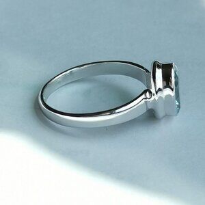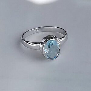 Sterling silver oval cut blue topaz ring with a bezel setting.