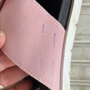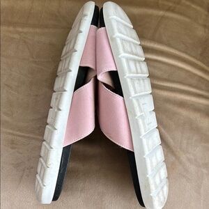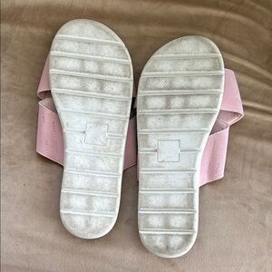 Experience the perfect blend of style and comfort with these pink criss-cross sandals. Featuring wide, padded straps in a soft pink hue, these slip-on sandals are designed for casual elegance. Elastic insert to adjust to your width. The minimalist design and flat sole make them ideal for everyday wear. See last pic where there is blue line where they sewed. Not noticeable when wearing. No size written but fit 8.5. Excellent condition.