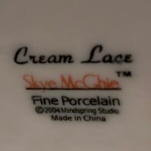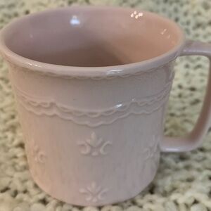 Skye McGhie pink child’s drinking mug. 2.75 inches tall with a diameter of 3 inches. Cream Lace pattern. Made in 2004. Excellent condition, no marks or damage of any kind.