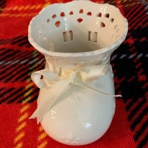 Ivory colored porcelain baby bootie shaped vase by Skye McGhie, from 2004. 3 inches high and diameter at the top is also 3 inches. Perforated lace design around the top. Excellent condition, no chips, cracks or scratches. Rare item.
