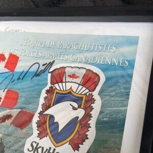 Skyhawks Canadian Armed Forces Parachute Team Framed Signed Picture 2015 12" x 9.5" is the measurements of the frame. There are many signatures here, I seem to count a different amount each time, I'd say there are 15 or more and it's possible all the signatures of the parachute team, some are slightly faded.