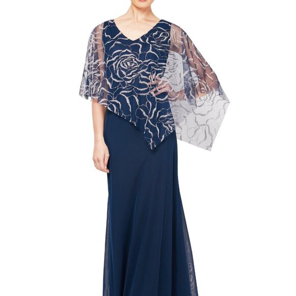 Sl Fashions Popover V Neck Glitter Floral with Asymetric Cape - Navy