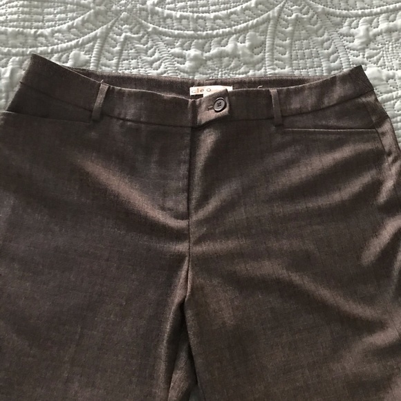 Grey slacks, two front pockets, 2 back pockets (never unsown).
