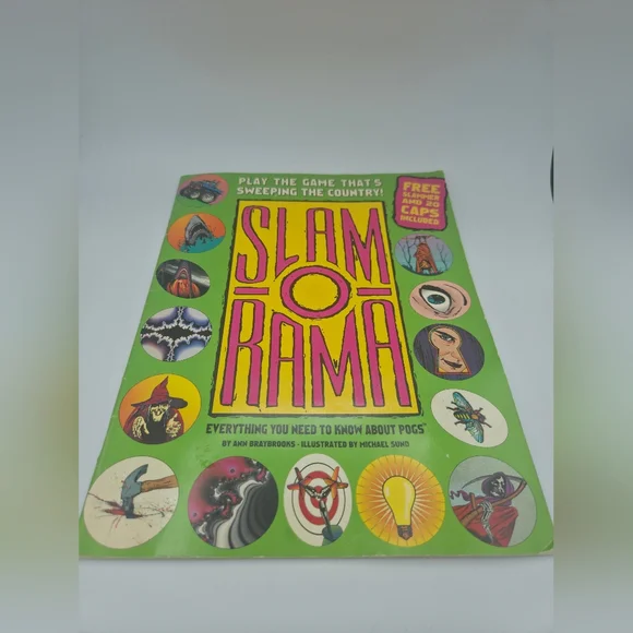 Slam-O-Rama pogs guide book with bold pink and yellow logo. Bright green background with colorful circular illustrations. Graphic, playful design. Great for collectors and fans.