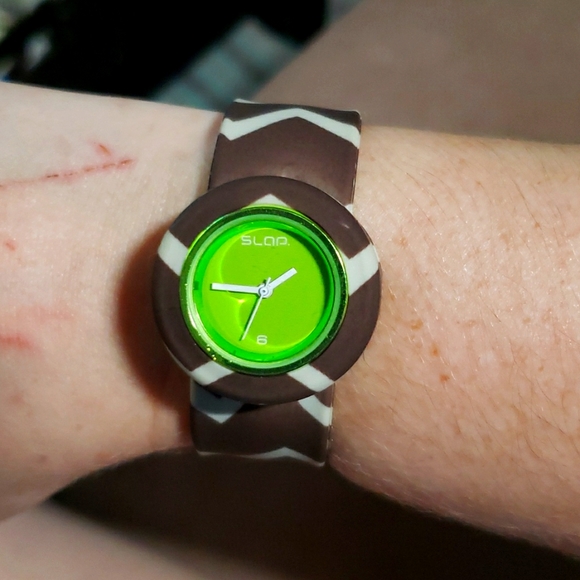 Authentic Slapwatch. Cute band with a striking green face. Needs new battery
