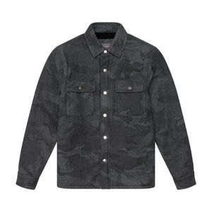 Military-inspired camo printing decorates a fleece lined overshirt offer a unique appearance into any ensemble.