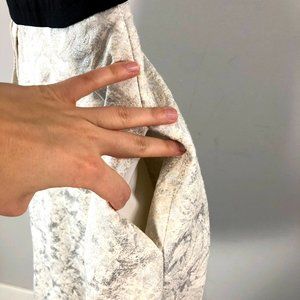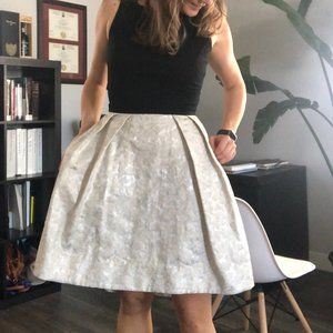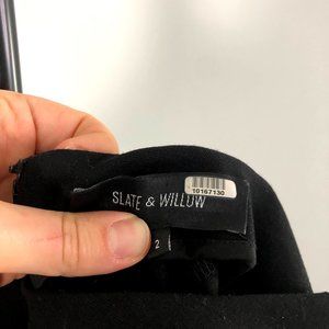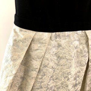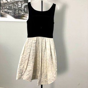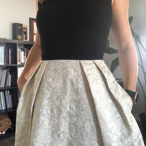 Slate & Willow Black and White Flare dress. Thick luxurious fabric. Bottom skirt is patterned, pleated, and has a shine to it. Pockets. Knee length. High neck, scoop back. Slate & Willow size 4 (true to size or maybe even size 6)
