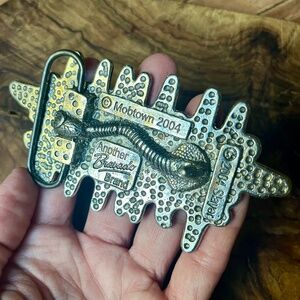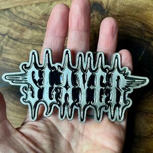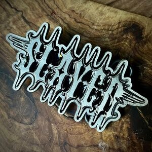 Slayer belt buckle, heavy duty embossed silver metal and black enamel, with snake and dice on backside. Vintage from 2004 Mobtown, Bravado. Like new, never used.