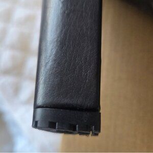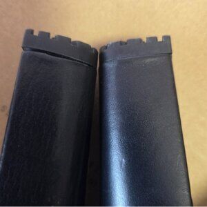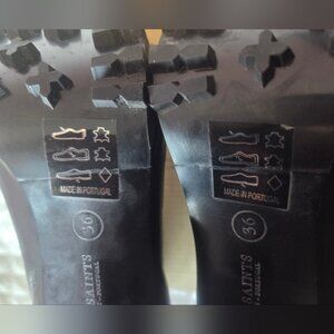 These All Saints black heeled boots feature a sophisticated design with a chunky high heel and a sleek silhouette. Made from quality materials, they offer a minimalist look with a rounded toe and elastic side panels for easy wear. The treaded rubber sole ensures a secure grip, making it a versatile choice for any occasion.