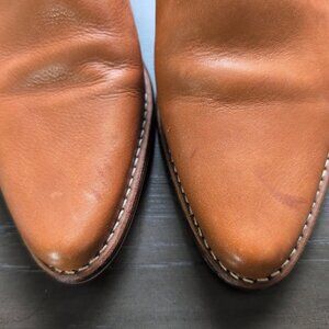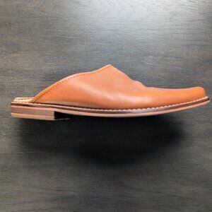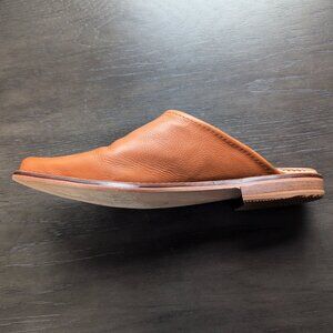 These elegant mules feature a minimalist design with high-quality brown leather and a pointed toe. The open back allows for easy slip-on wear, while the visible stitching adds a touch of durability and style.