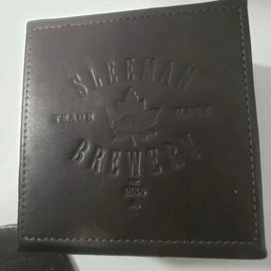 Sleeman Brewery set of 5 brown leather coasters comes with a leather/canvas/velvet magnetic closure box.