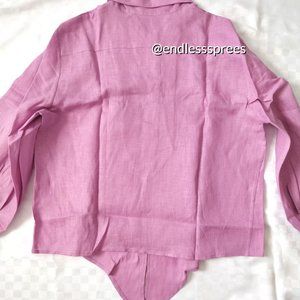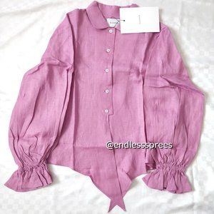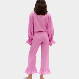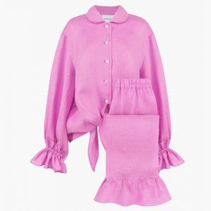 Brand new Sleeper Rumba Linen Lounge 2 Piece Suit set in Pink. The Rumba summer leisure set is made in a relaxed fit. Cut a playful figure in this relaxed summer leisure set, which features a tie-front top with long puff sleeves and ruffle-trimmed, ankle-length trousers. The top comes as a shirt with long puff sleeves, ruffle-trimmed, and ties at the bottom. Ruffles trim the straight ankle-length trousers. A matching scarf comes with the set. Top and pants match perfectly with casual everyday clothes. The shirt can be worn with denim, skirts, or shorts. The trousers can be complemented with a blouse, T-shirt or a jacket. 100% linen STANDARD 100 by OEKO-TEX®.