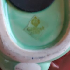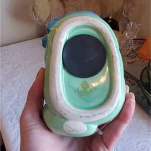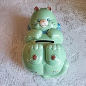 Sleeping "Fat Cat" mint green with red tulips 🌷and blue polka-dot bow. Super cute! Tiny chip on tip of one ear as seen in photos, hardly noticeable :) has original rubber stopper and makers sticker