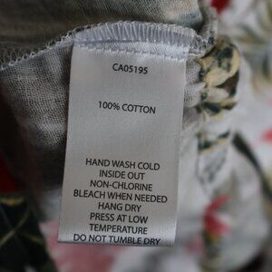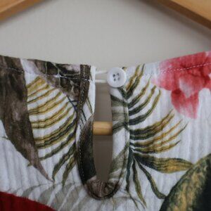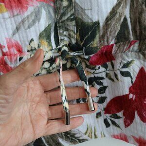 This pretty sleeveless top features a floral and leaf pattern. It has a drawstring at the waist in the front only. There is a keyhole in the back, but your head will easily fit through. It has a linen look to it.