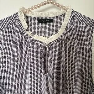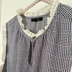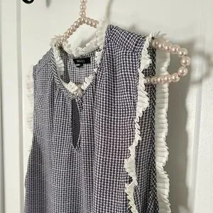 Soft blue check sleeveless top with delicate white ruffle trim. Comfortable lightweight fabric for everyday wear. Keyhole neckline for a feminine touch. Pairs easily with jeans or skirts for a casual-chic look.