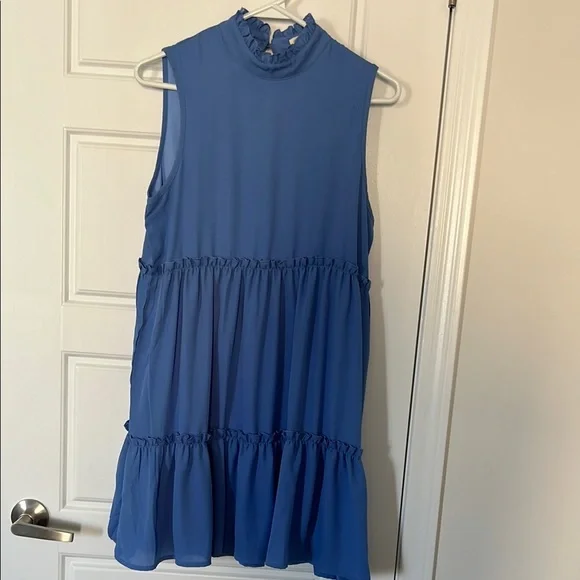 Chic sleeveless dress with ruffle details. Elegant blue color.