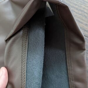 Brown pleather mini dress with strong shoulders (a little padding in the shoulders), pockets and a keyhole closure in the back. It is also lined with a finished hem so it's great for cooler weather as well.