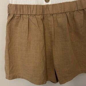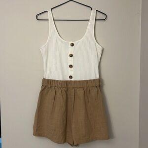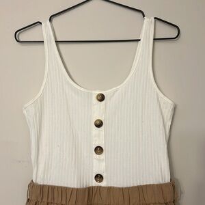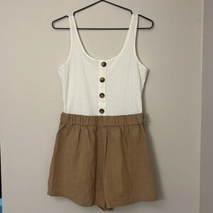 Cami romper features ribbed knit fabric, notched neck, tank top decorative buttons, elastic waist