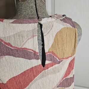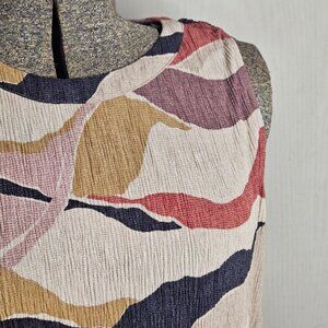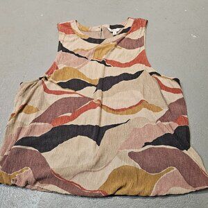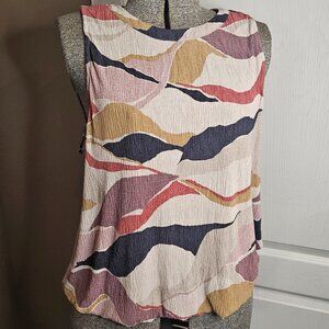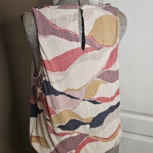 Sleeveless blouse in lovely earth tones. XL. Lightweight. Excellent transitional piece for the office. Crew neckline with button detail at the back of the neck. Elastic on the hem gives it a nice blousy look.
