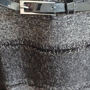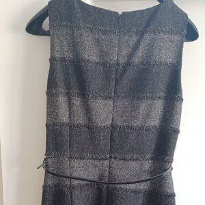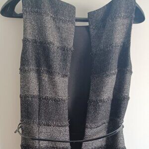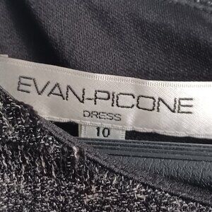 Lined sleeveless Evan Picone dress size 10. Grey two toned with fringe like detail on each band. Flattering with or without belt. Easy care polyester/rayon. Length just above knee (will depend on your height.) Hardly worn, looks new. Great look for the office or about town.