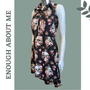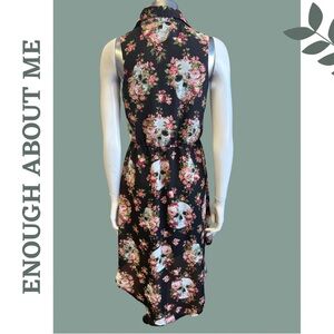 Sleeveless High Low Dress Floral Skull Print button front Elasticic waist Black