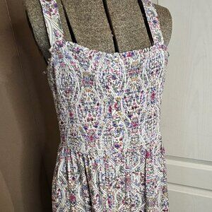 Lightweight patterned midi dress. Square neckline and smocked top. Wide shoulder straps. Decorate button-down front. Fit and flare. 100% viscose. Unlined.