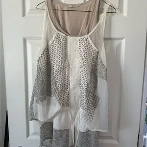 Stylish sleeveless top with intricate patterns. Features a mix of white and gray colors. Perfect for casual wear.
