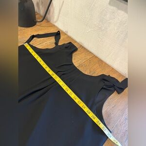 Chic and flowy black sleeveless dress with front pleats for an elegant drape and a soft A-line silhouette. Features a feminine V-back with a self-tie bow at the neckline. Lightweight and fully lined for comfort and ease. A timeless piece that transitions effortlessly from office wear to evening outings.