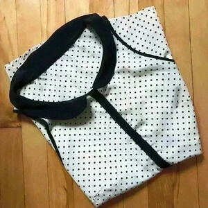Ivory colour very light fabric with black dots, accented with black collar, placket, and armhole trim.