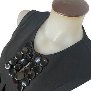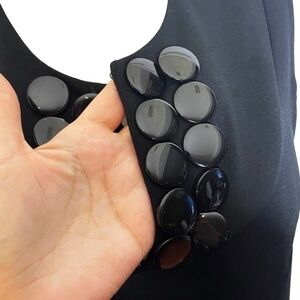Great stretch sleeveless dress with detailed button embellishment, front inverted box pleats, in excellent condition.Has a real unique retro vibe!