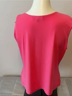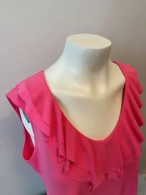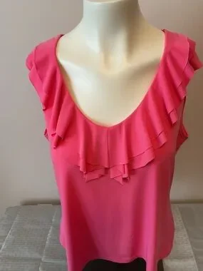 Lightweight sleeveless top in vibrant pink. Ruffle neckline Soft smooth fabric Pit to pit 21 inches