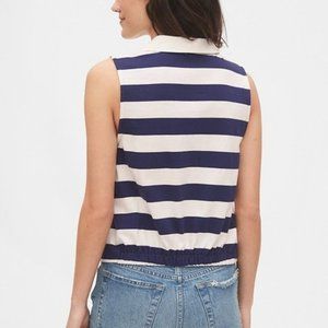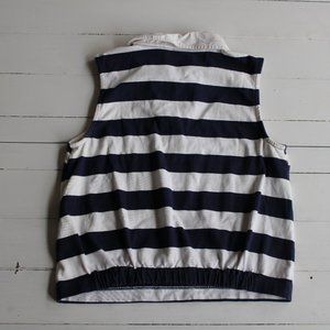 A sleeveless rugby polo shirt with collar and navy and white stripes. Perfect for a summer by the lake. Very coastal chic.