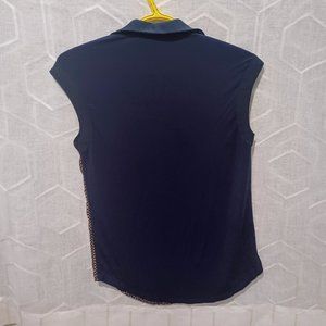 Sleeveless summer top which is ideal for summer wear. 100% Polyester. In good condition. The shirt is marked XXS however the size is more U.S. small and will fit someone who is around 120 lbs and 5"4. The front has shades of brown and blue and the back is solid navy blue