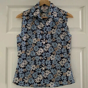 Navy, light blue, white and tan floral. Button front with collar. In immaculate condition.