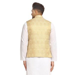 Make your occasion special with Latest in trend Sleeveless Traditional Brocade Silk Fabric Light Golden Nehru Jacket. This Men Nehru Jacket featuring contrasting buttons on the placket, Welt pockets and a Zari Work design. Explore the wide range of Finest Quality Silk Nehru Jacket/Waistcoat for Men also attire for winter festive or wedding looks. The Mandarin collar leads to a full button placket along the front which adds to the look. Paired with Kurta, suit or Formal Trousers.
