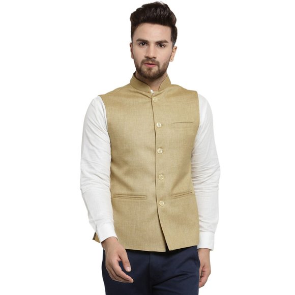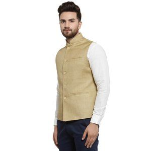 Make your occasion special with Latest in trend Sleeveless Traditional Jute Fabric Beige Nehru Jacket. This Men Nehru Jacket featuring contrasting buttons on the placket, front pockets and a simplistic design. Explore the wide range of Finest Quality Jute Nehru Jacket/Waistcoat for Men also attire for winter festive or wedding looks. The Mandarin collar leads to a full button placket along the front which adds to the look. Paired with Kurta, suit or Formal Trousers.