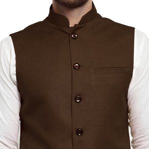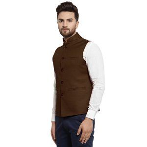 Make your occasion special with Latest in trend Sleeveless Traditional Jute Fabric Chocolate Brown Nehru Jacket. This Men Nehru Jacket featuring contrasting buttons on the placket, front pockets and a simplistic design. Explore the wide range of Finest Quality Jute Nehru Jacket/Waistcoat for Men also attire for winter festive or wedding looks. The Mandarin collar leads to a full button placket along the front which adds to the look. Paired with Kurta, suit or Formal Trousers.