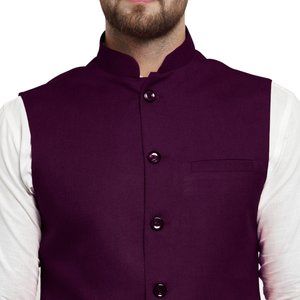 Make your occasion special with Latest in trend Sleeveless Traditional Jute Fabric Purple Nehru Jacket. This Men Nehru Jacket featuring contrasting buttons on the placket, front pockets and a simplistic design. Explore the wide range of Finest Quality Jute Nehru Jacket/Waistcoat for Men also attire for winter festive or wedding looks. The Mandarin collar leads to a full button placket along the front which adds to the look. Paired with Kurta, suit or Formal Trousers.