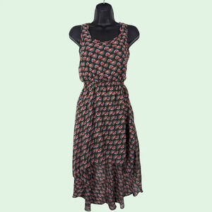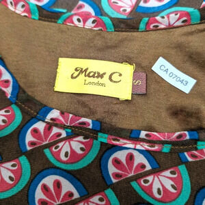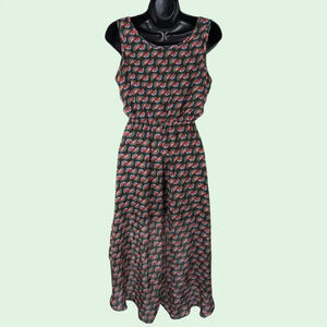 This watermelon dress by Max C London is fun and very flirty. The hem of this dress is shorter in the front and longer in the back and has a brown inner lining. The elastic waist allows some leeway for size, and then dress is very comfortable overall. There is no damage or issues beyond normal wear.