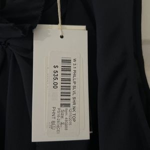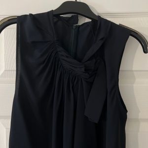 Navy long silk sleeveless blouse , back zipper. Beautiful detail on the neck. Never been worn, tags attached.