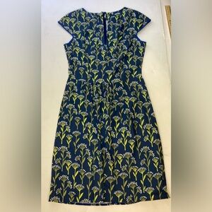 Sleeveless blue cotton summer dress, with green and white floral motif. Small