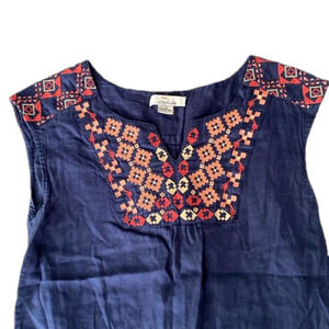 Pretty Blue lightweight sleeveless blouse with embroidery on shoulders, chest and across the upper back.
