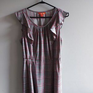 Joe Fresh sleeveless plaid dress with a large checker print. Red and grey. Flattering neck line.