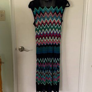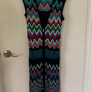 A colourful fine knit knee length dress with some sliver threading throughout which adds a little glimmer when the light hits it. The background is dark navy and includes a navy underslip. This dress can be worn year round