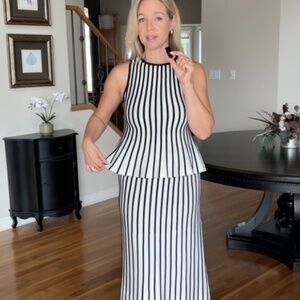Knitted sleeveless peplum striped top and matching midi pencil skirt in striped fabric