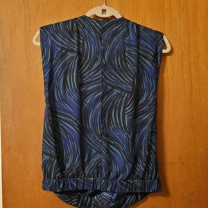 Sleeveless top. Light weight with v neck in front and open back. The back of the shirt has an opening. Good for work or dinner out.