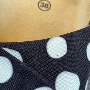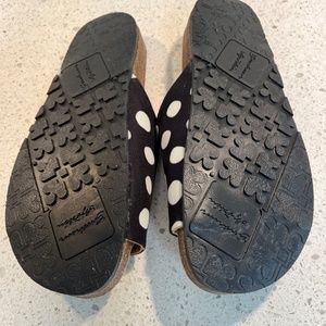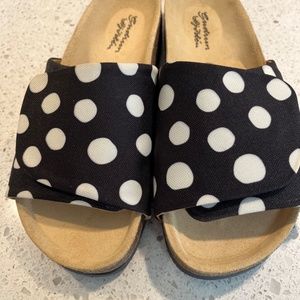 Funky and cute Gudrun Sjoden slide sandals. Cavas black and white polka dot uppers adjust with Velcro. Suede lined footbed, cork soles, rubber outsoles. Size 38. They measure 9” inside the insole and just over 3 1/2 across the widest part of the outsole bottom. These are like new and were only worn once. Bottom soles have been wiped as they were a bit dusty. Insides immaculate. One speck on a polka dot was there when I got them.